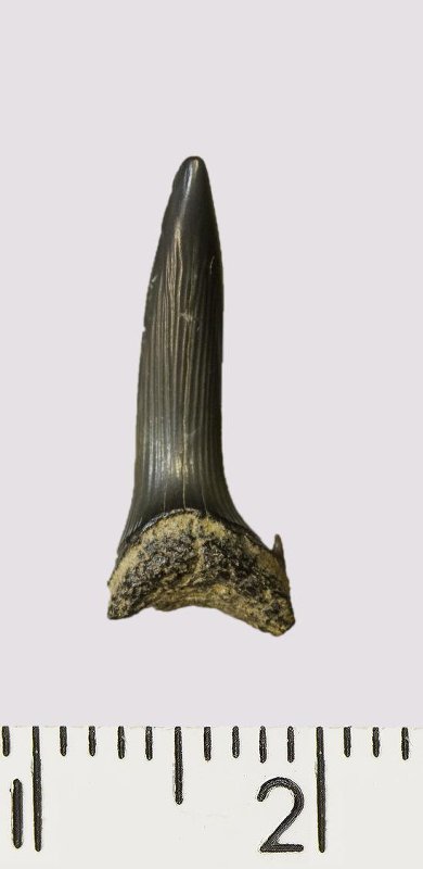 Зуб. Акула. Scapanorhynchus rhaphiodon Agassiz, 1843. Классификация: Хордовые Chordata, Позвоночные Vertebrata, Хрящевые рыбы Chondrichthyes, Пластиножаберные Elasmobranchii