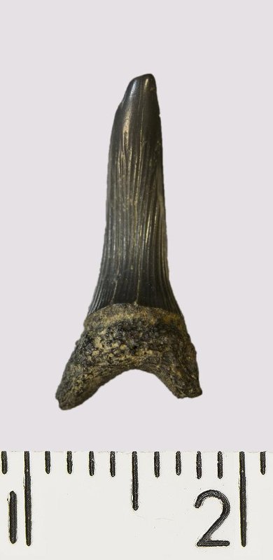 Зуб. Акула. Scapanorhynchus rhaphiodon Agassiz, 1843. Классификация: Хордовые Chordata, Позвоночные Vertebrata, Хрящевые рыбы Chondrichthyes, Пластиножаберные Elasmobranchii