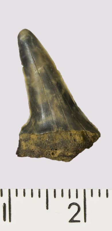 Зуб (фрагмент). Акула. Scapanorhynchus gigas Woodward, 1889. Классификация: Хордовые Chordata, Позвоночные Vertebrata, Хрящевые рыбы Chondrichthyes, Пластиножаберные Elasmobranchii
