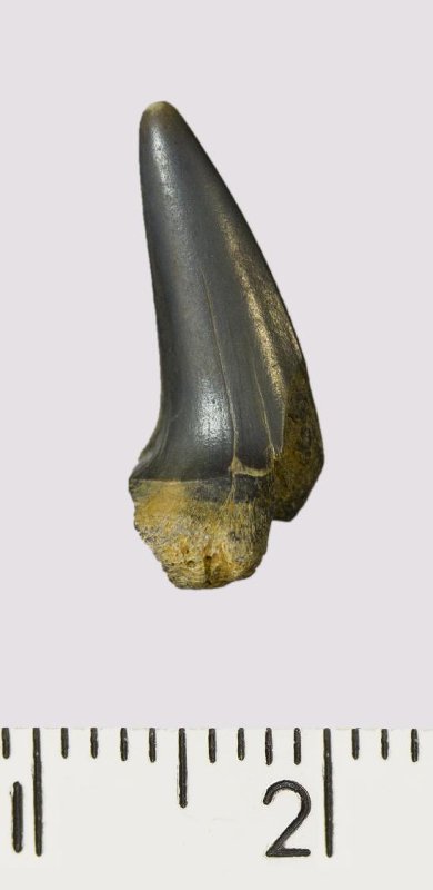 Зуб (фрагмент). Акула. Scapanorhynchus gigas Woodward, 1889. Классификация: Хордовые Chordata, Позвоночные Vertebrata, Хрящевые рыбы Chondrichthyes, Пластиножаберные Elasmobranchii