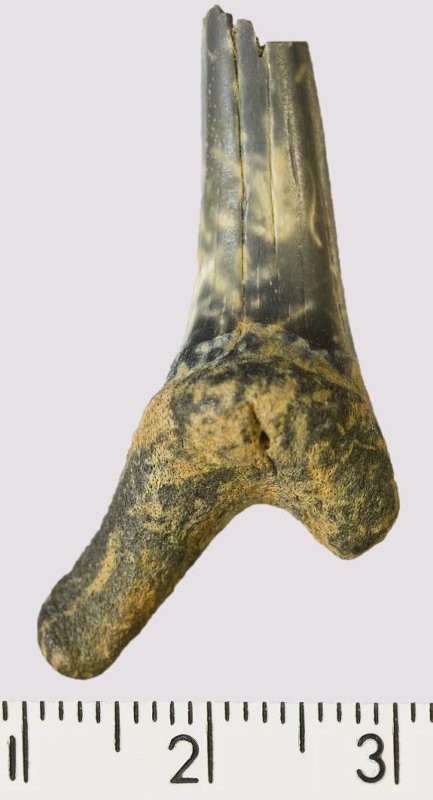 Зуб. Акула. Scapanorhynchus gigas Woodward, 1889. Классификация: Хордовые Chordata, Позвоночные Vertebrata, Хрящевые рыбы Chondrichthyes, Пластиножаберные Elasmobranchii