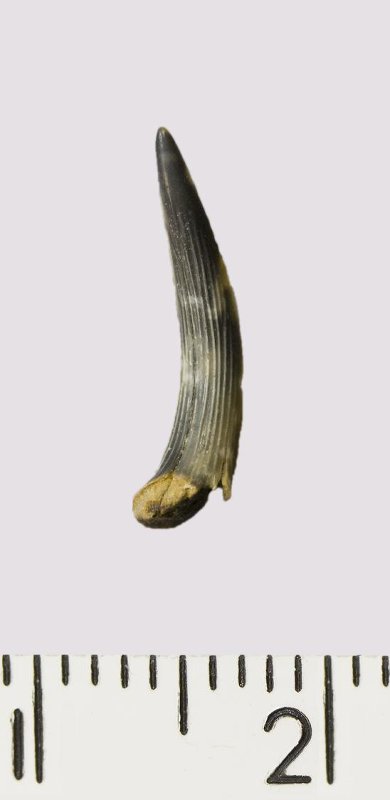 Зуб (фрагмент). Акула. Scapanorhynchus rhaphiodon Agassiz, 1843. Классификация: Хордовые Chordata, Позвоночные Vertebrata, Хрящевые рыбы Chondrichthyes, Пластиножаберные Elasmobranchii