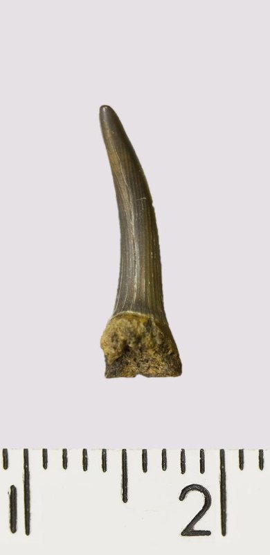 Зуб (фрагмент). Акула. Scapanorhynchus rhaphiodon Agassiz, 1843. Классификация: Хордовые Chordata, Позвоночные Vertebrata, Хрящевые рыбы Chondrichthyes, Пластиножаберные Elasmobranchii