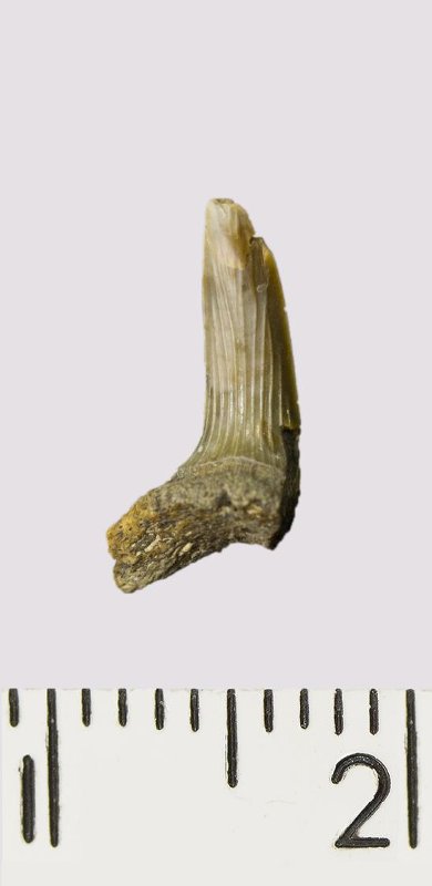Зуб. Акула. Scapanorhynchus rhaphiodon Agassiz, 1843. Классификация: Хордовые Chordata, Позвоночные Vertebrata, Хрящевые рыбы Chondrichthyes, Пластиножаберные Elasmobranchii