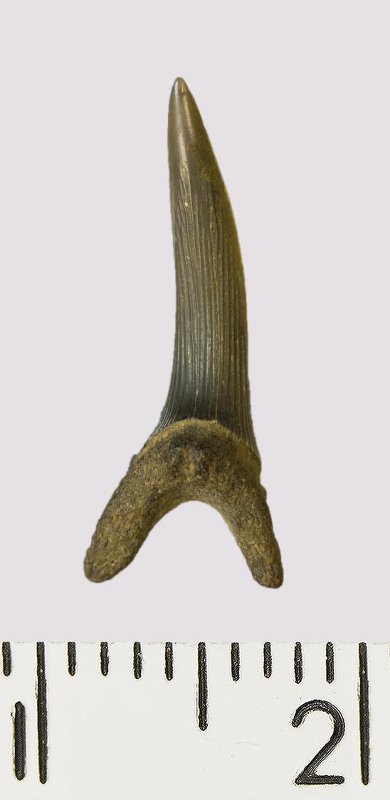 Зуб. Акула. Scapanorhynchus rhaphiodon Agassiz, 1843. Классификация: Хордовые Chordata, Позвоночные Vertebrata, Хрящевые рыбы Chondrichthyes, Пластиножаберные Elasmobranchii