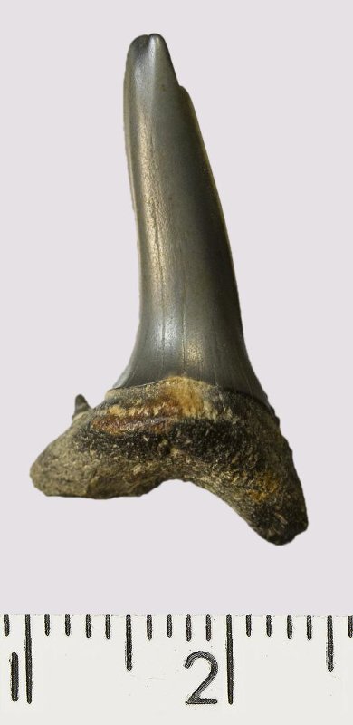 Зуб. Акула. Scapanorhynchus gigas Woodward, 1889. Классификация: Хордовые Chordata, Позвоночные Vertebrata, Хрящевые рыбы Chondrichthyes, Пластиножаберные Elasmobranchii