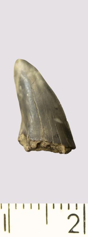 Зуб (фрагмент). Акула. Scapanorhynchus gigas Woodward, 1889. Классификация: Хордовые Chordata, Позвоночные Vertebrata, Хрящевые рыбы Chondrichthyes, Пластиножаберные Elasmobranchii