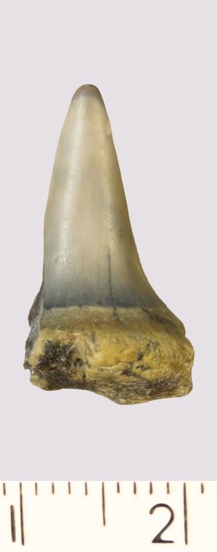 Зуб (фрагмент). Акула. Scapanorhynchus gigas Woodward, 1889. Классификация: Хордовые Chordata, Позвоночные Vertebrata, Хрящевые рыбы Chondrichthyes, Пластиножаберные Elasmobranchii