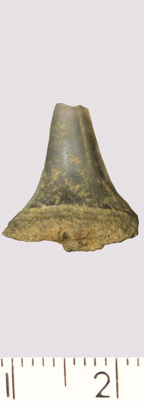 Зуб (фрагмент). Акула. Scapanorhynchus gigas Woodward, 1889. Классификация: Хордовые Chordata, Позвоночные Vertebrata, Хрящевые рыбы Chondrichthyes, Пластиножаберные Elasmobranchii