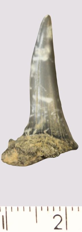 Зуб (фрагмент). Акула. Scapanorhynchus gigas Woodward, 1889. Классификация: Хордовые Chordata, Позвоночные Vertebrata, Хрящевые рыбы Chondrichthyes, Пластиножаберные Elasmobranchii
