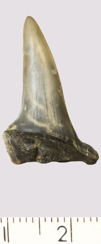 Зуб (фрагмент). Акула. Scapanorhynchus gigas Woodward, 1889. Классификация: Хордовые Chordata, Позвоночные Vertebrata, Хрящевые рыбы Chondrichthyes, Пластиножаберные Elasmobranchii