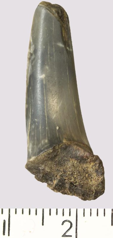 Зуб (фрагмент). Акула. Scapanorhynchus gigas Woodward, 1889. Классификация: Хордовые Chordata, Позвоночные Vertebrata, Хрящевые рыбы Chondrichthyes, Пластиножаберные Elasmobranchii