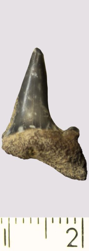 Зуб. Акула. Scapanorhynchus gigas Woodward, 1889. Классификация: Хордовые Chordata, Позвоночные Vertebrata, Хрящевые рыбы Chondrichthyes, Пластиножаберные Elasmobranchii