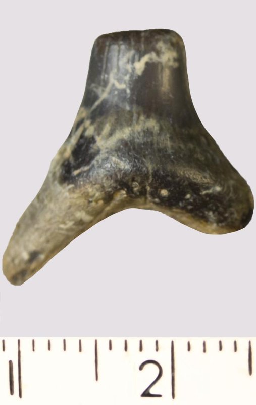 Зуб. Акула. Scapanorhynchus gigas Woodward, 1889. Классификация: Хордовые Chordata, Позвоночные Vertebrata, Хрящевые рыбы Chondrichthyes, Пластиножаберные Elasmobranchii