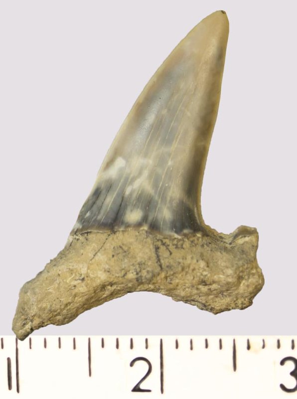 Зуб. Акула. Scapanorhynchus gigas Woodward, 1889. Классификация: Хордовые Chordata, Позвоночные Vertebrata, Хрящевые рыбы Chondrichthyes, Пластиножаберные Elasmobranchii