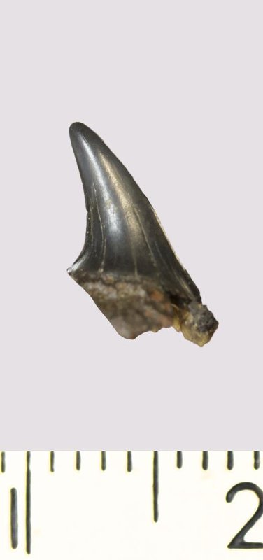 Зуб (фрагмент). Акула. Odontaspis macrorhiza (Cope) Leriche, 1902. Классификация: Хордовые Chordata, Позвоночные Vertebrata, Хрящевые рыбы Chondrichthyes, Пластиножаберные Elasmobranchii