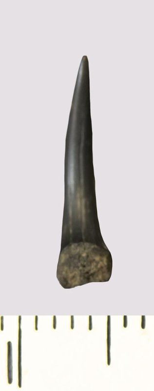 Зуб (фрагмент). Акула. Scapanorhynchus rhaphiodon Agassiz, 1843. Классификация: Хордовые Chordata, Позвоночные Vertebrata, Хрящевые рыбы Chondrichthyes, Пластиножаберные Elasmobranchii