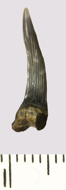 Зуб (фрагмент). Акула. Scapanorhynchus rhaphiodon Agassiz, 1843. Классификация: Хордовые Chordata, Позвоночные Vertebrata, Хрящевые рыбы Chondrichthyes, Пластиножаберные Elasmobranchii