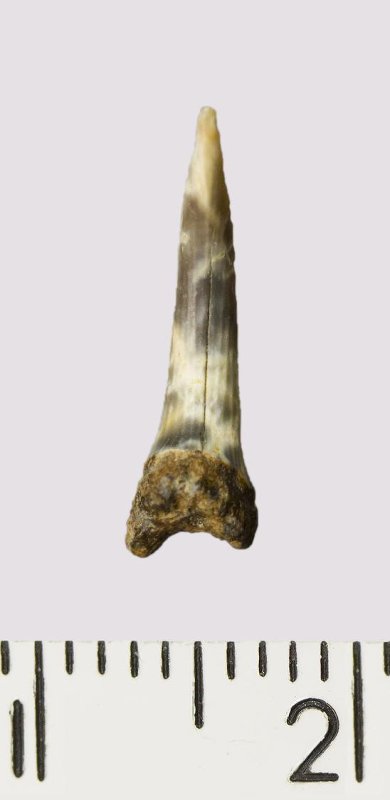 Зуб. Акула. Scapanorhynchus rhaphiodon Agassiz, 1843. Классификация: Хордовые Chordata, Позвоночные Vertebrata, Хрящевые рыбы Chondrichthyes, Пластиножаберные Elasmobranchii