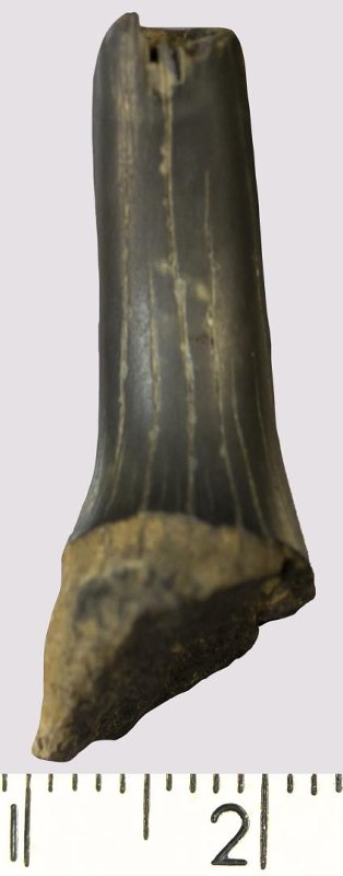 Зуб (фрагмент). Акула. Scapanorhynchus gigas Woodward, 1889. Классификация: Хордовые Chordata, Позвоночные Vertebrata, Хрящевые рыбы Chondrichthyes, Пластиножаберные Elasmobranchii