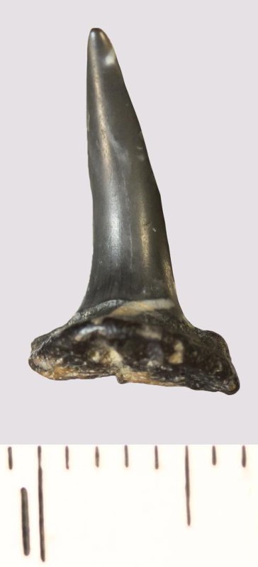 Зуб (фрагмент). Акула. Scapanorhynchus rhaphiodon Agassiz, 1843. Классификация: Хордовые Chordata, Позвоночные Vertebrata, Хрящевые рыбы Chondrichthyes, Пластиножаберные Elasmobranchii