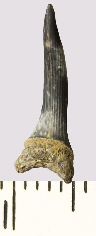 Зуб. Акула. Scapanorhynchus rhaphiodon Agassiz, 1843. Классификация: Хордовые Chordata, Позвоночные Vertebrata, Хрящевые рыбы Chondrichthyes, Пластиножаберные Elasmobranchii