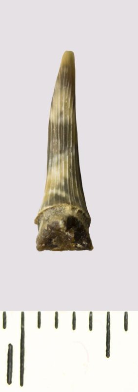 Зуб (фрагмент). Акула. Scapanorhynchus rhaphiodon Agassiz, 1843. Классификация: Хордовые Chordata, Позвоночные Vertebrata, Хрящевые рыбы Chondrichthyes, Пластиножаберные Elasmobranchii