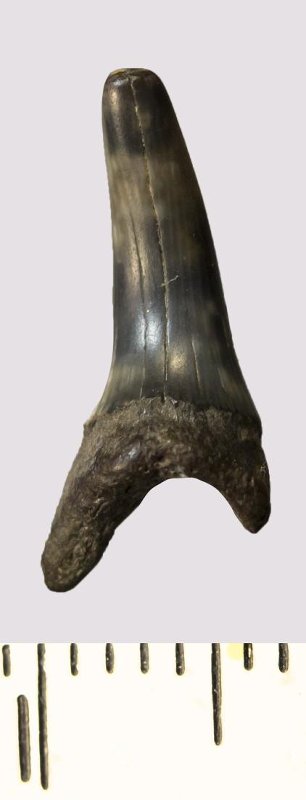 Зуб. Акула. Scapanorhynchus rhaphiodon Agassiz, 1843. Классификация: Хордовые Chordata, Позвоночные Vertebrata, Хрящевые рыбы Chondrichthyes, Пластиножаберные Elasmobranchii