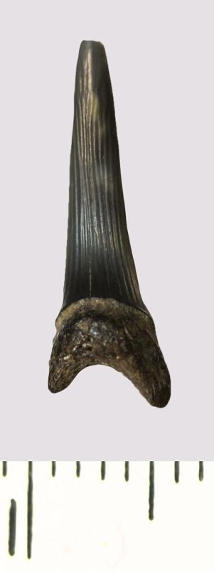 Зуб. Акула. Scapanorhynchus rhaphiodon Agassiz, 1843. Классификация: Хордовые Chordata, Позвоночные Vertebrata, Хрящевые рыбы Chondrichthyes, Пластиножаберные Elasmobranchii