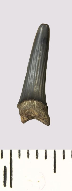 Зуб. Акула. Scapanorhynchus rhaphiodon Agassiz, 1843. Классификация: Хордовые Chordata, Позвоночные Vertebrata, Хрящевые рыбы Chondrichthyes, Пластиножаберные Elasmobranchii