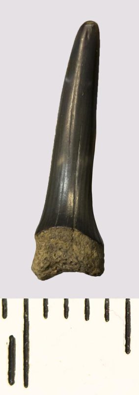 Зуб. Акула. Scapanorhynchus rhaphiodon Agassiz, 1843. Классификация: Хордовые Chordata, Позвоночные Vertebrata, Хрящевые рыбы Chondrichthyes, Пластиножаберные Elasmobranchii