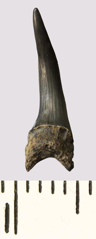 Зуб. Акула. Scapanorhynchus rhaphiodon Agassiz, 1843. Классификация: Хордовые Chordata, Позвоночные Vertebrata, Хрящевые рыбы Chondrichthyes, Пластиножаберные Elasmobranchii