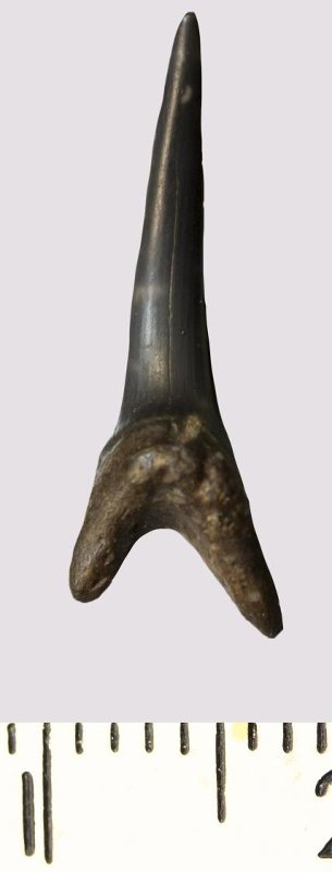 Зуб. Акула. Scapanorhynchus rhaphiodon Agassiz, 1843. Классификация: Хордовые Chordata, Позвоночные Vertebrata, Хрящевые рыбы Chondrichthyes, Пластиножаберные Elasmobranchii