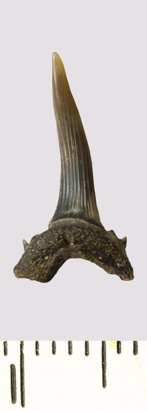 Зуб. Акула. Scapanorhynchus rhaphiodon Agassiz, 1843. Классификация: Хордовые Chordata, Позвоночные Vertebrata, Хрящевые рыбы Chondrichthyes, Пластиножаберные Elasmobranchii