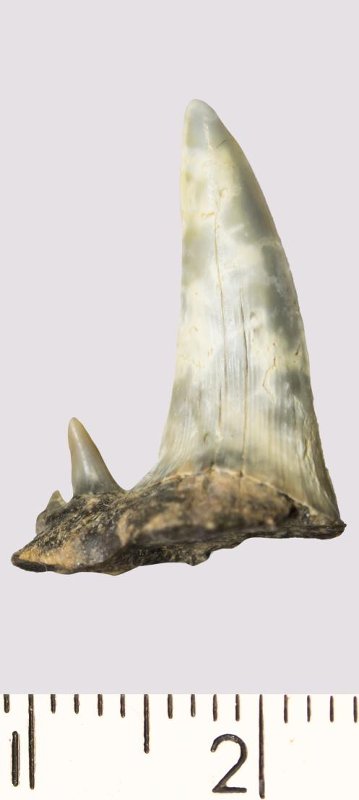 Зуб (фрагмент). Акула. Rhaphiodus sp. Классификация: Хордовые Chordata, Позвоночные Vertebrata, Хрящевые рыбы Chondrichthyes, Пластиножаберные Elasmobranchii