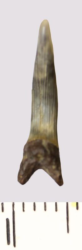 Зуб. Акула. Scapanorhynchus rhaphiodon Agassiz, 1843. Классификация: Хордовые Chordata, Позвоночные Vertebrata, Хрящевые рыбы Chondrichthyes, Пластиножаберные Elasmobranchii