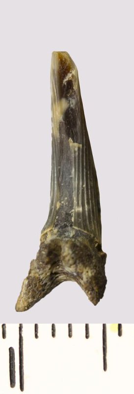 Зуб. Акула. Scapanorhynchus rhaphiodon Agassiz, 1843. Классификация: Хордовые Chordata, Позвоночные Vertebrata, Хрящевые рыбы Chondrichthyes, Пластиножаберные Elasmobranchii