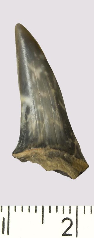 Зуб (фрагмент). Акула. Scapanorhynchus gigas Woodward, 1889. Классификация: Хордовые Chordata, Позвоночные Vertebrata, Хрящевые рыбы Chondrichthyes, Пластиножаберные Elasmobranchii