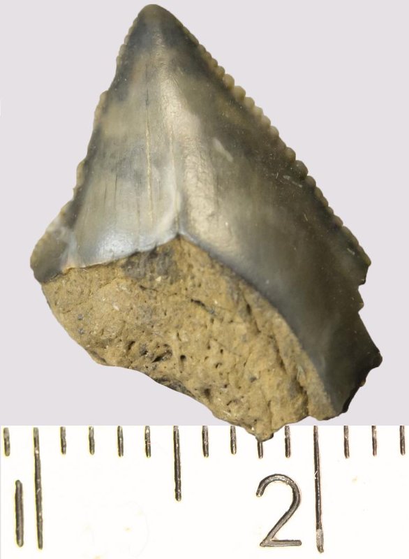 Зуб (фрагмент). Акула. Anacorax kaupi (Agassiz, 1843). Классификация: Хордовые Chordata, Позвоночные Vertebrata, Хрящевые рыбы Chondrichthyes, Пластиножаберные Elasmobranchii