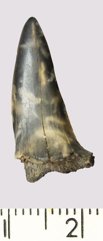 Зуб (фрагмент). Акула. Scapanorhynchus gigas Woodward, 1889. Классификация: Хордовые Chordata, Позвоночные Vertebrata, Хрящевые рыбы Chondrichthyes, Пластиножаберные Elasmobranchii