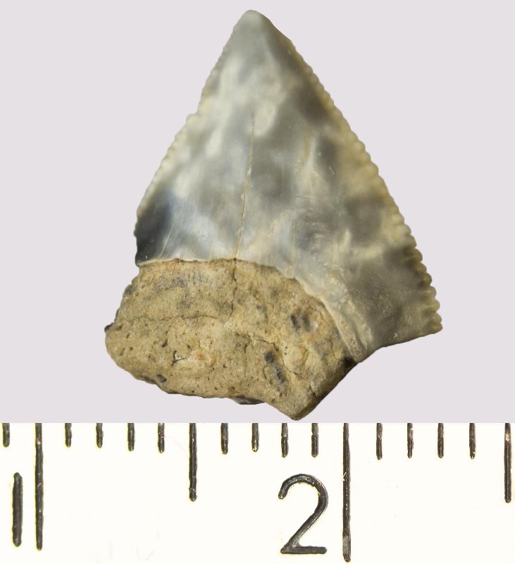 Зуб (фрагмент). Акула. Anacorax kaupi (Agassiz, 1843). Классификация: Хордовые Chordata, Позвоночные Vertebrata, Хрящевые рыбы Chondrichthyes, Пластиножаберные Elasmobranchii