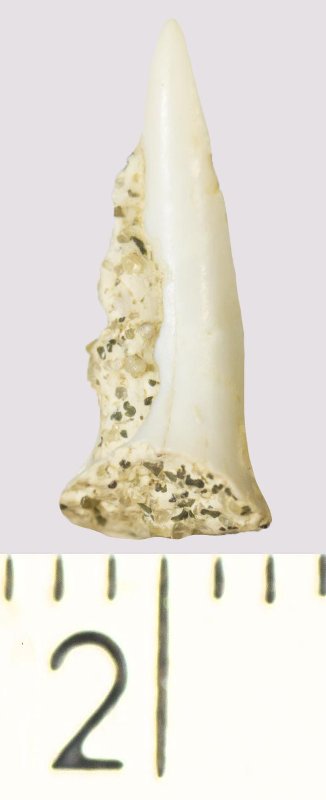 Зуб (фрагмент). Акула. Odontaspis venusta (Leriche, 1929). Классификация: Хордовые Chordata, Позвоночные Vertebrata, Хрящевые рыбы Chondrichthyes, Пластиножаберные Elasmobranchii