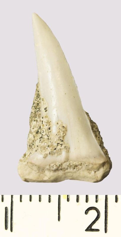 Зуб (фрагмент). Акула. Rhaphiodus sp. Классификация: Хордовые Chordata, Позвоночные Vertebrata, Хрящевые рыбы Chondrichthyes, Пластиножаберные Elasmobranchii