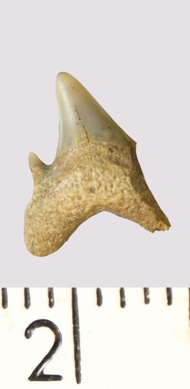 Зуб. Акула. Odontaspis macrorhiza (Cope) Leriche, 1902. Классификация: Хордовые Chordata, Позвоночные Vertebrata, Хрящевые рыбы Chondrichthyes, Пластиножаберные Elasmobranchii