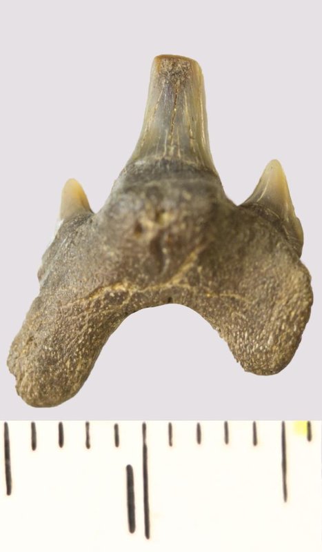 Зуб. Акула. Odontaspis macrorhiza (Cope) Leriche, 1902. Классификация: Хордовые Chordata, Позвоночные Vertebrata, Хрящевые рыбы Chondrichthyes, Пластиножаберные Elasmobranchii
