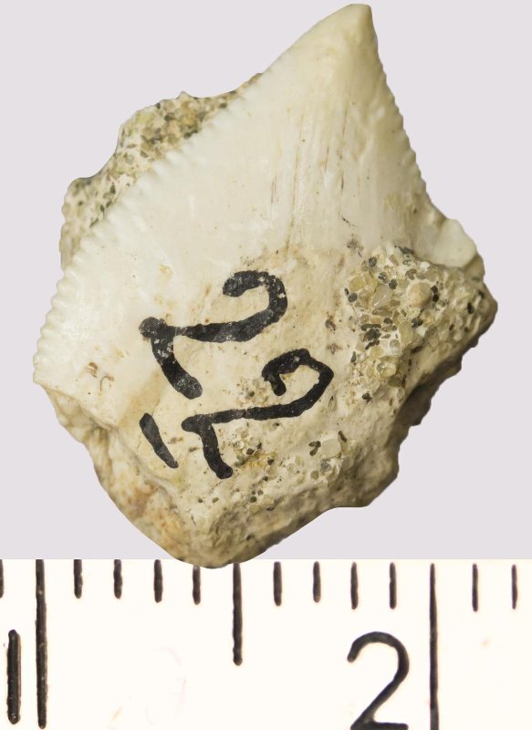 Зуб (фрагмент). Акула. Anacorax kaupi (Agassiz, 1843). Классификация: Хордовые Chordata, Позвоночные Vertebrata, Хрящевые рыбы Chondrichthyes, Пластиножаберные Elasmobranchii