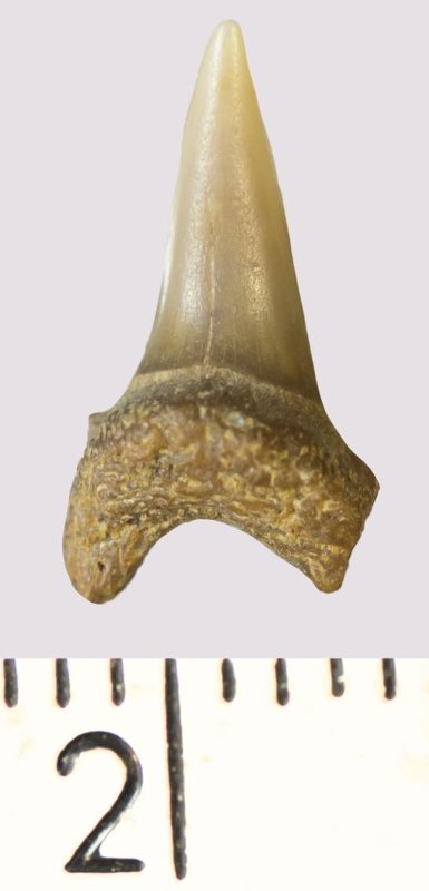 Зуб. Акула. Odontaspis macrorhiza (Cope) Leriche, 1902. Классификация: Хордовые Chordata, Позвоночные Vertebrata, Хрящевые рыбы Chondrichthyes, Пластиножаберные Elasmobranchii