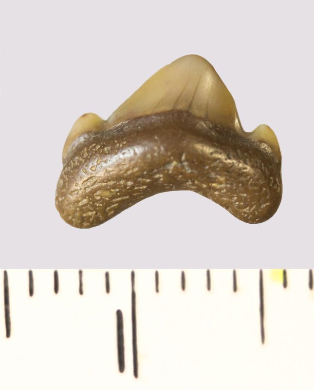 Зуб. Акула. Odontaspis macrorhiza (Cope) Leriche, 1902. Классификация: Хордовые Chordata, Позвоночные Vertebrata, Хрящевые рыбы Chondrichthyes, Пластиножаберные Elasmobranchii