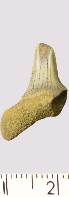 Зуб. Акула. Scapanorhynchus gigas Woodward, 1889. Классификация: Хордовые Chordata, Позвоночные Vertebrata, Хрящевые рыбы Chondrichthyes, Пластиножаберные Elasmobranchii