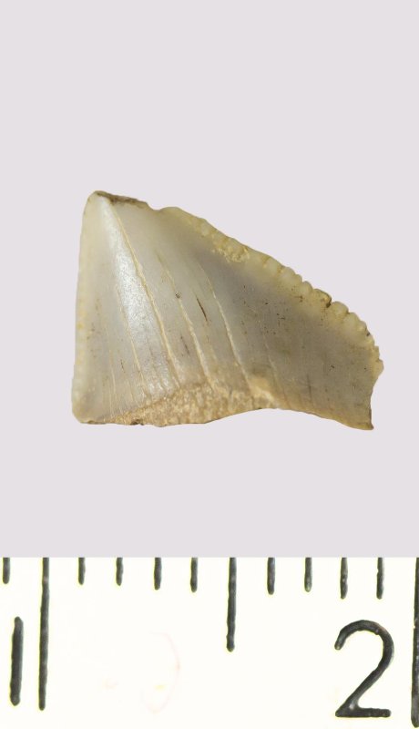 Зуб (фрагмент). Акула. Anacorax kaupi (Agassiz, 1843). Классификация: Хордовые Chordata, Позвоночные Vertebrata, Хрящевые рыбы Chondrichthyes, Пластиножаберные Elasmobranchii